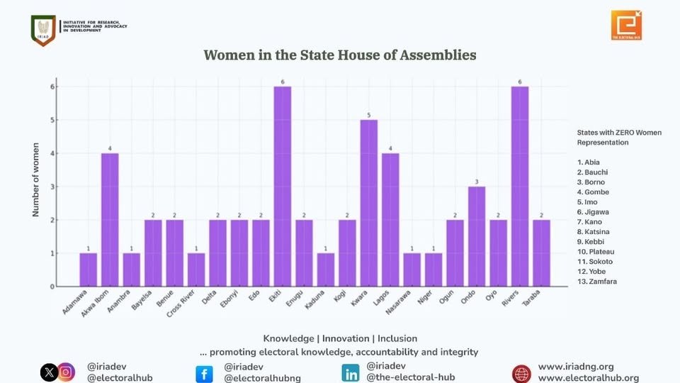 Rivers and Ekiti States lead with 6 women each in their State House of Assemblies, but 13 states still have ZERO female representation.