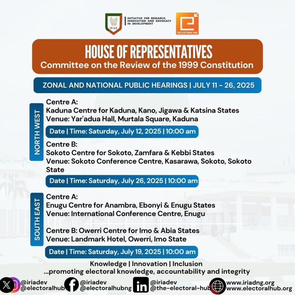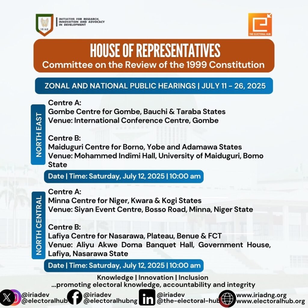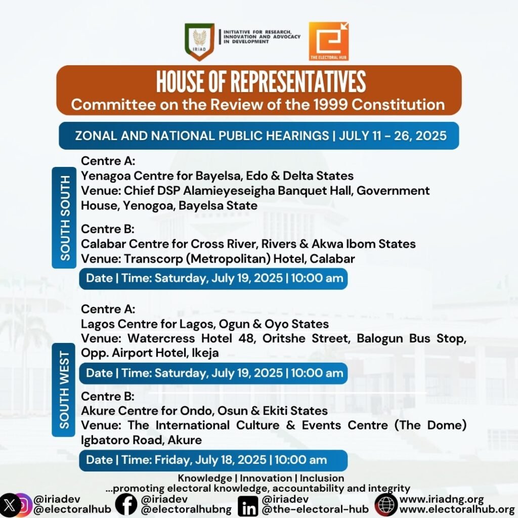 The House of Representatives’ Zonal and National Public Hearings on the 1999 Constitution Review kick off on July 11, 2025!
